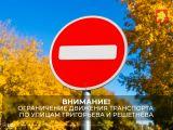 27 сентября с 8:00 до 17:30 будет временно прекращено движение автотранспорта: по проезду к СК «Октябрь», к плавательному бассейну «Труд», к спортивной площадке «СЮТ».