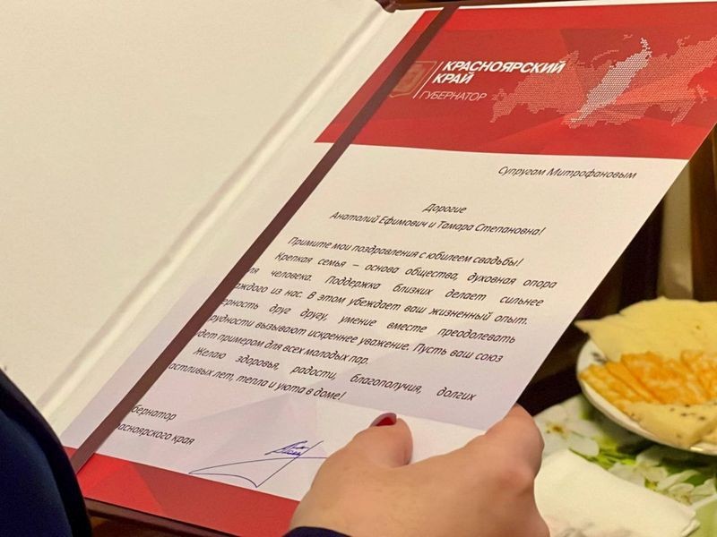 Замечательную пару с юбилеем поздравили заместитель Главы ЗАТО г. Железногорск Юлия Грудинина, а также руководители АО «РЕШЕТНЁВ» Евгений Патраев и Александр Берестов. Руководитель Железногорского территориального отдела агентства ЗАГС Дина Степанцова зачитала поздравление от имени Губернатора Красноярского края Михаила Котюкова.