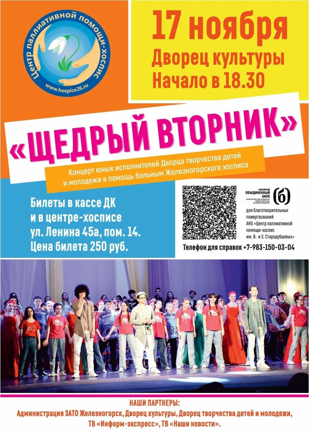 Билеты на концерт #ЩЕДРЫЙВТОРНИК, можно приобрести в кассе Дворца культуры и в Центре-хосписе: ул. Ленина, 45а, пом. 14. Стоимость 250 рублей. Есть вопросы? Звоните +7-983-150-03-04.